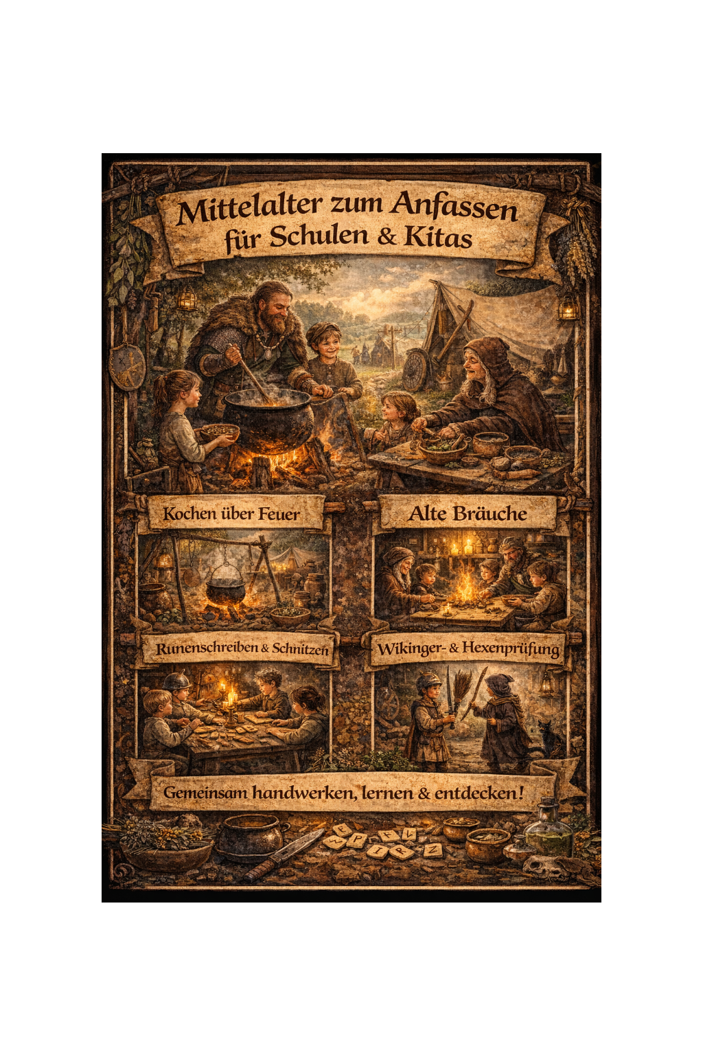 Wir zeigen Kindern, wie das Mittelalter wirklich war: nicht nur Kämpfe, Ritter und langweilige Jahreszahlen, sondern das echte Leben unserer Vorfahren. Wie haben sie gekocht? Welche Spiele spielten sie? Welche Bräuche und Rituale kannten sie? Wie schrieb man Runen? All diese Fragen werden bei uns mit Herz, Spaß und Handwerk beantwortet.